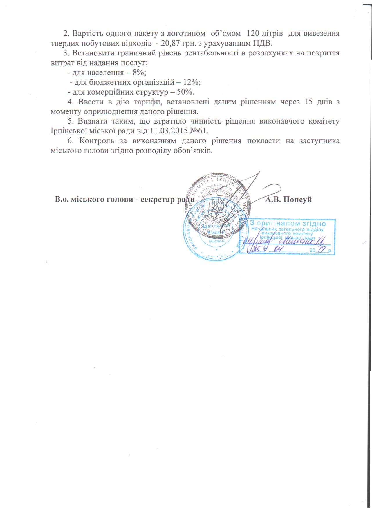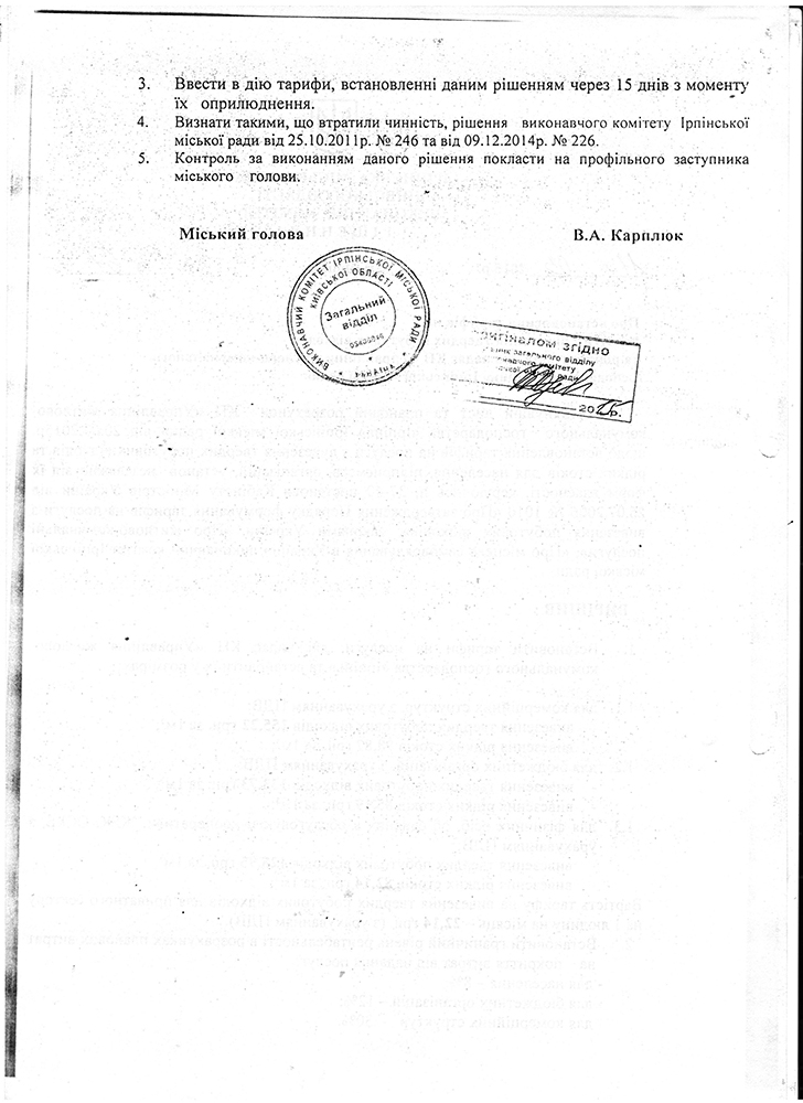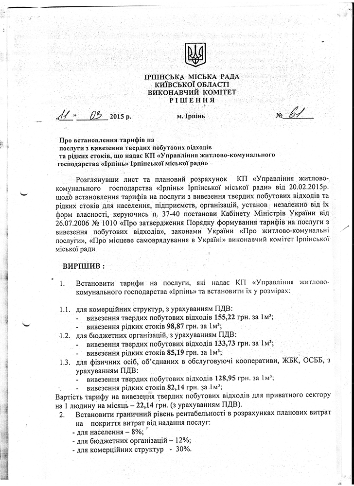 13.03.2015 Тарифи на послуги з вивезення твердих побутових відходів та рідких стоків затверджені рішенням виконавчого комітету Ірпінської міської ради №61 від 11.03.2015 року.