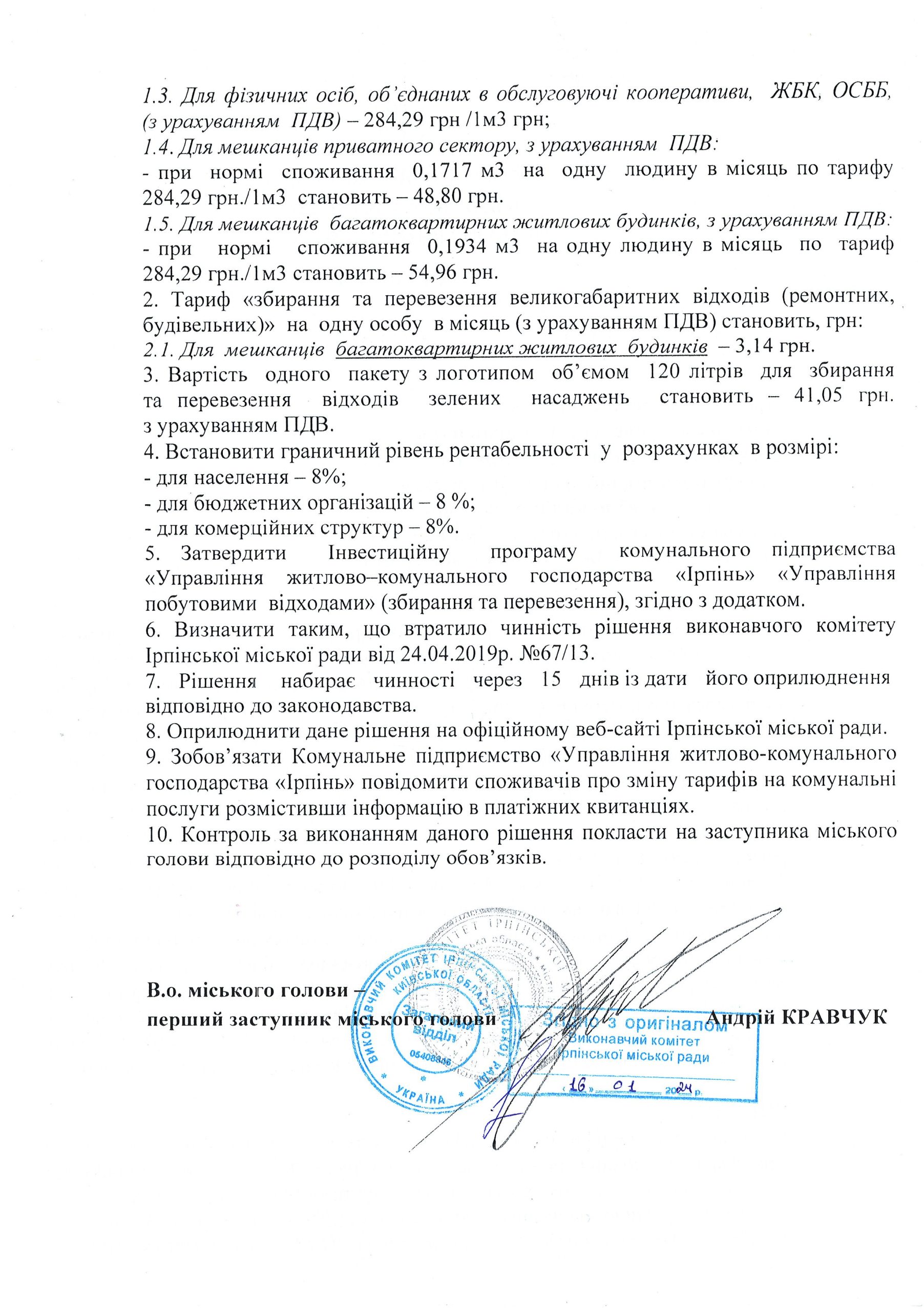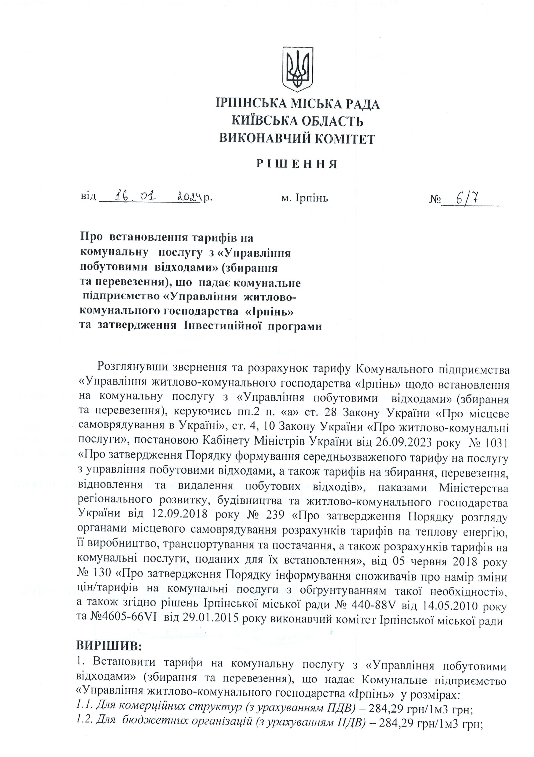 16.01.2024 Тарифи на комунальну послугу з “Управління побутовими відходами” (збирання та перевезення) затверджені рішенням виконавчого комітету Ірпінської міської ради №6/7 від 16.01.2024 року.