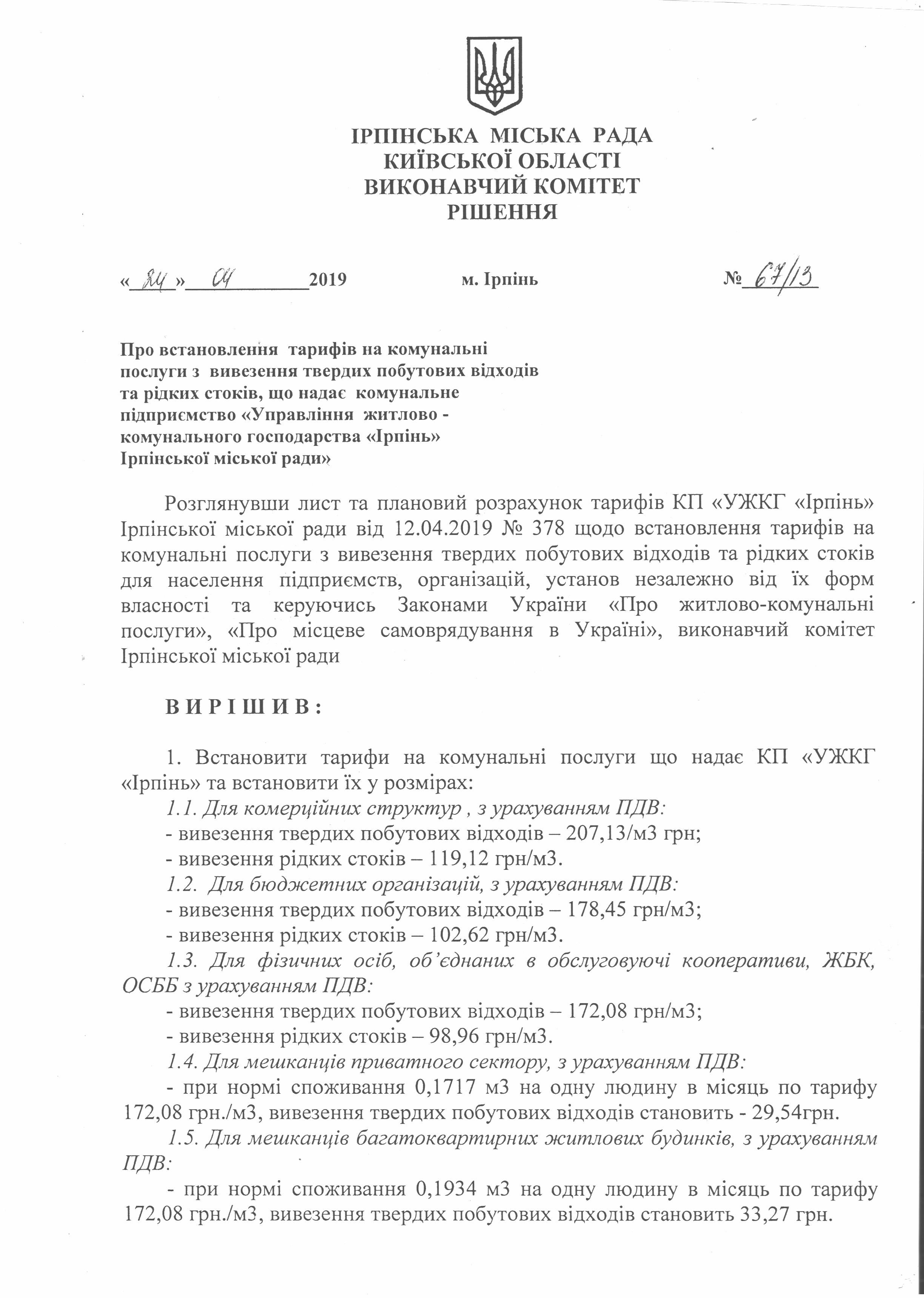 24.04.2019 Тарифи на послуги з вивезення твердих побутових відходів та рідких стоків затверджені рішенням виконавчого комітету Ірпінської міської ради №67/13 від 24.04.2019 року.