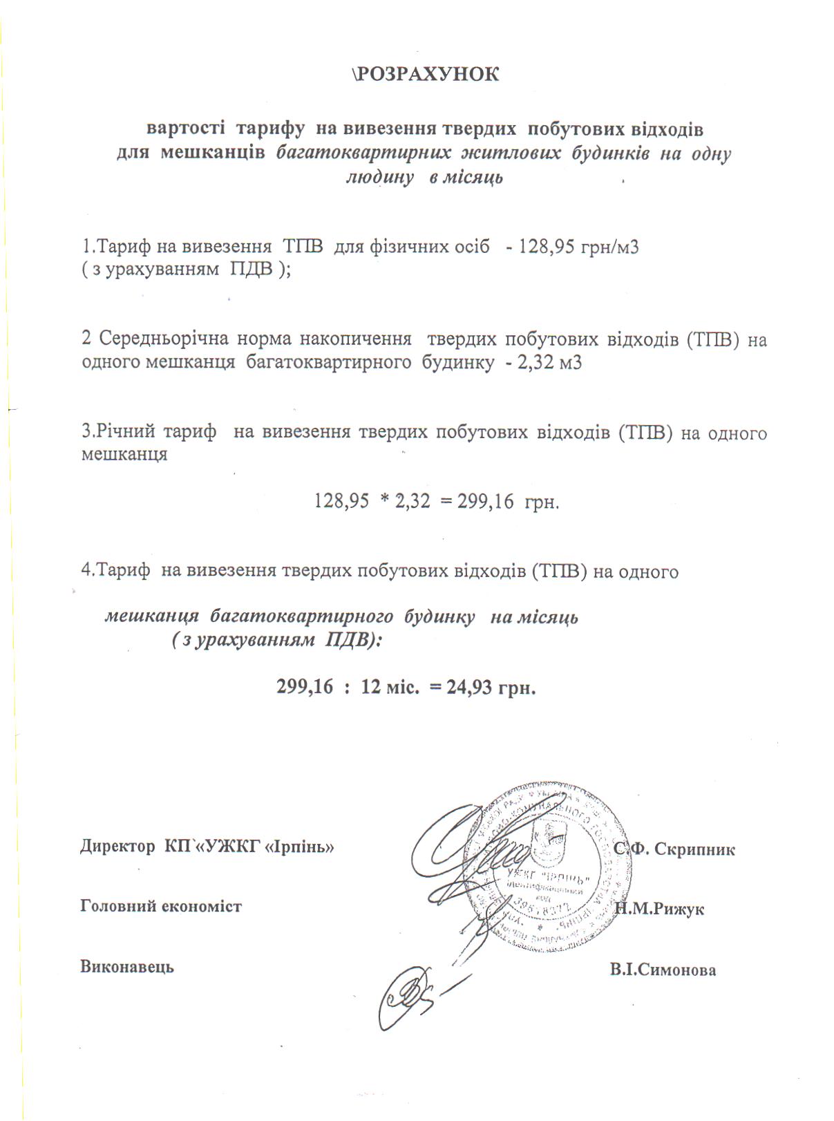 Розраховані тарифи по плановій собівартості відповідно до “Порядку формування тарифів на послуги з вивезення побутових відходів” затвердженого постановою Кабінету Міністрів України від 26.07.2006 року №1010 та “Норм накопичення твердих побутових відходів на одну людину по м.Ірпінь та селищах Гостомель, Коцюбинське, Ворзель затверджених рішенням сесії Ірпінської міської ради від 14.05.2010 року №4400-88-V та продовжених до 2020 року рішенням сесії Ірпінської міської ради від 29.01.2015 року №4605-66-VI.
